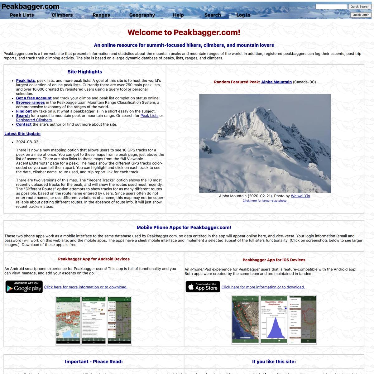 Peakbagger.com is a free web site that presents information and statistics about the mountain peaks and mountain ranges of the world. In addition, registered peakbaggers can log their ascents, post trip reports, and track their climbing activity. The site is based on a large dynamic database of peaks, lists, ranges, and climbers.